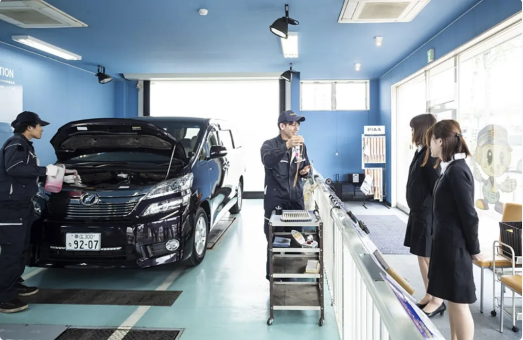 検査ラインで行なう車検作業の全てを見学コースでご覧いただきます。検査の結果は診断カルテで説明いたします。